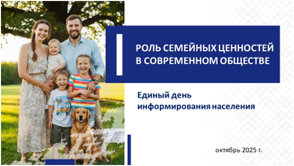 16.10.2025 в коллективе Жлобинского районного центра технического творчества детей и молодёжи прошёл Единый день информирования по теме Роль семейных ценностей в современном обществе. Были освещены вопросы: Государственная политика, направленная на сохранение традиционных семейных ценностей; Духовно-нравственное воспитание – один из важнейших факторов развития страны и обеспечения духовного единства народа; Традиционные семейные ценности как фундамент многовекового уклада жизни белорусского народа.