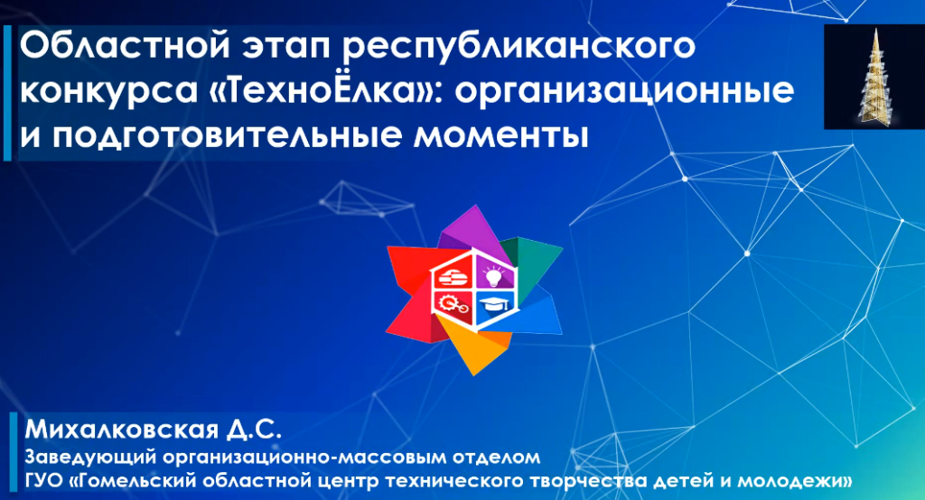 06.11.2025 г. прошёл областной онлайн-семинар по подготовке к областному этапу республиканского конкурса «ТехноЁлка», где обсуждались организационные вопросы конкурса, сроки предоставления экспонатов, а также выступали педагоги, подготовившие победителей республиканского конкурса «ТехноЁлка»-2024. На совещании выступил педагог Жлобинского районного центра технического творчества Тополев В.Б., продемонстрировавший свою работу над проектом «Ёлка-трансформер».